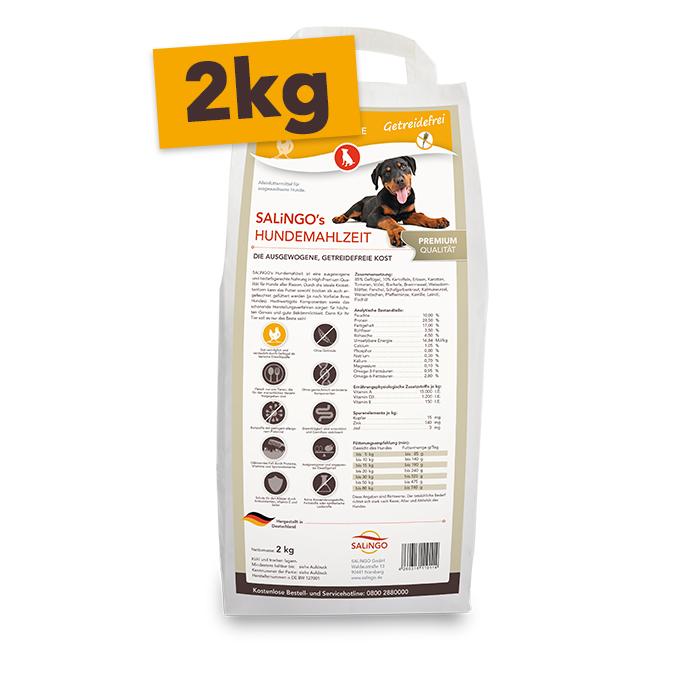 Mit diesem getreidefreien SALiNGO Einsteigerpaket für Hunde können Sie Ihren Hund das Futter probieren lassen und die positiven Effekte feststellen. (Glänzenderes Fell, weniger Blähungen, mehr Vitalität, etc. ) Kleine Futterproben eignen sich nicht zum Testen, da man mit nur einer Dose nicht feststellen kann, ob der Hund das Futter mag oder überhaupt verträgt. Dies ist nur mit einer schonenden Futterumstellung über einen längeren Zeitraum möglich. (Tipps zur Futterumstellung)