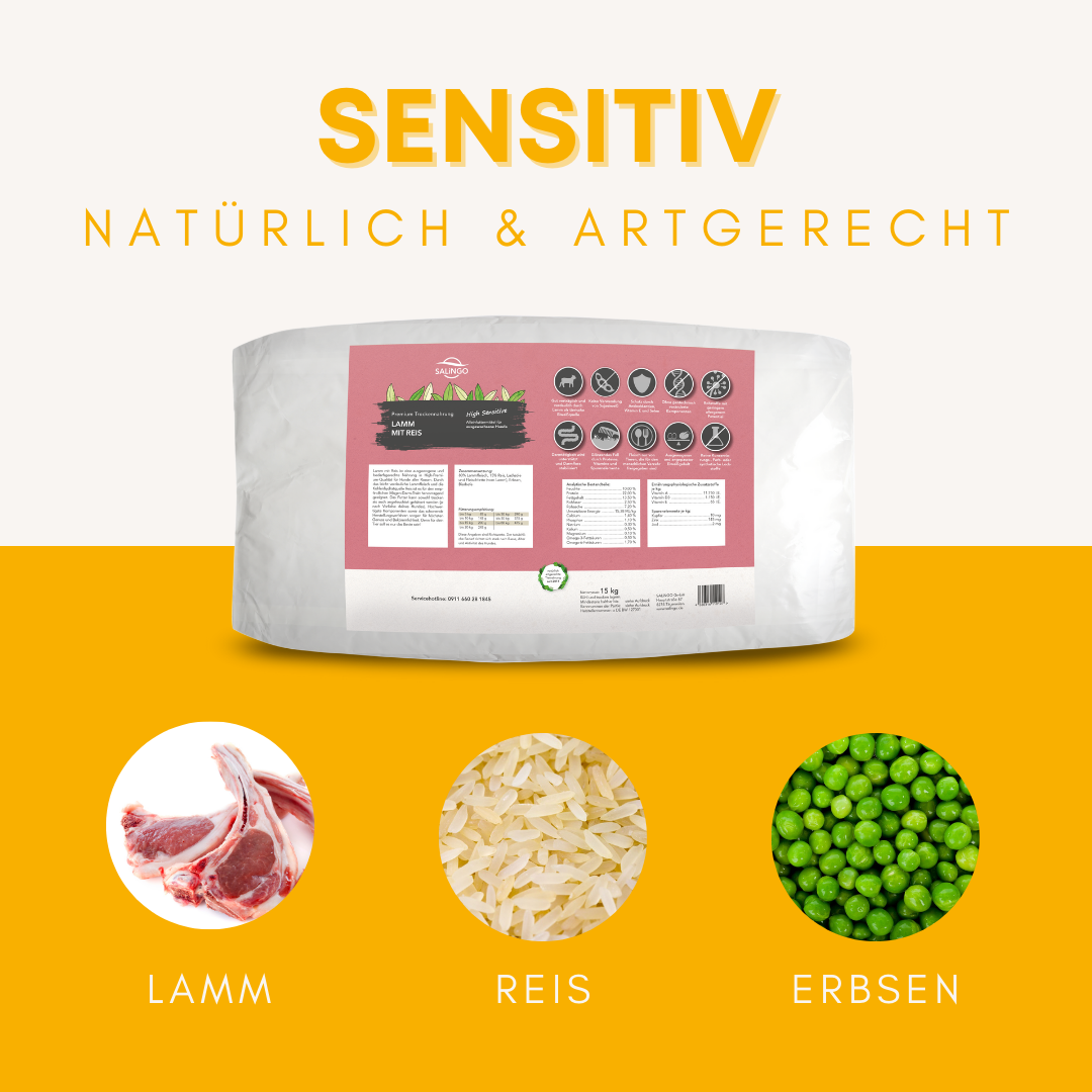 SALiNGO Lamm mit Reis ist ein artgerechtes, sensitives Trockenfutter in Premium Qualität für sensible Hunde aller Rassen. Sensible Hunde mit einem anfälligen Magen-Darm-Trakt benötigen sensitives Futter und Schonkost. Die verwendeten Rohstoffe in unserem Trockenfutter Lamm mit Reis weisen einen äußerst hohen natürlichen Nährstoffgehalt auf und versorgen den Hund bestens mit den benötigten Vitaminen, Nähr- und Mineralstoffen.